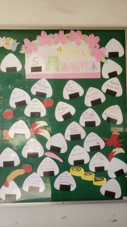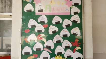 読み語りメンバーの皆さんによる手作り掲示物です。今月は、遠足シーズンということでお弁当をイメージした掲示です。