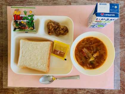 【食パン、アプリコットジャム、一口トンカツ、ミネストローネ、豆こんぶ、牛乳】