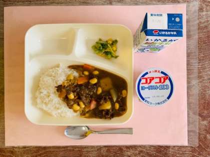 牛肉と大豆のカレーライスは、大豆煮を使用した毎年好評なカレーライスです。今日は、クラスに数個、ラッキーにんじんが入っていました。