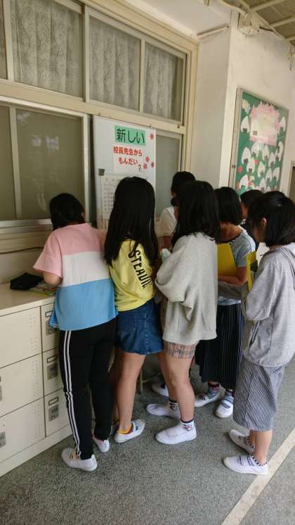 校長室前に掲示している「校長先生からの問題」。毎週楽しみにしている子どもたちもいます。クイズ形式ですが、実は論理的に深く考える必要があります。宿題+アルファとして取り組むことを通して、思考力を高めてくれることを願っています。