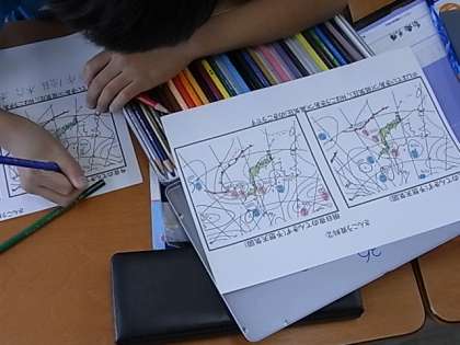 授業当日の雲の動きのデータを見せてもらうことで理解が深まり、授業の後半で、お天気キャスターになりきって、楽しく学習に取り組めたようです。