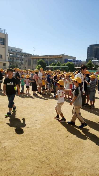 今日は運動場での集会です