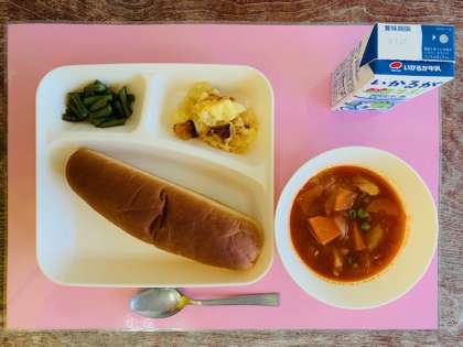 【黒糖パン、ケチャップ煮、さんどまめのソテー、りんごのクラフティ、牛乳】