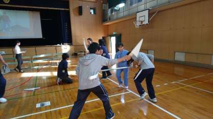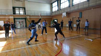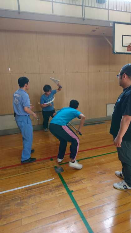 DVD視聴のあと、刺すまたを使っての実技研修。