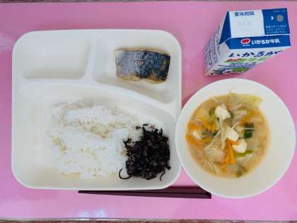 【ごはん、さごしの塩焼き、みそ汁、牛ひじきそぼろ、牛乳】