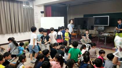 1年生全員が多目的室に集まっていました。一人一人に新聞紙が配られました。