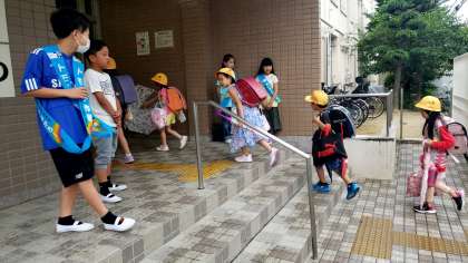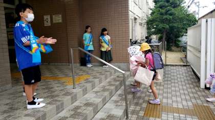 児童会の皆さんが正門に立ち、登校してくるみんなにあいさつをしています。 普段よりも挨拶を する子どもたちが多くいました。