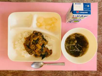 【和風カレー丼、もずくとオクラのとろり汁、和なし(缶)、牛乳】