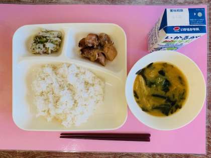 【ごはん、鶏肉の甘辛焼き、みそ汁、キャベツの赤じそあえ、牛乳】