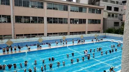 今日は1年生にとっては小学校生活初めての水泳学習です。歓声が校内に響いています