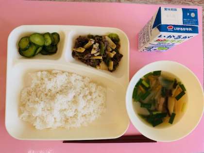 【ごはん、チンジャオニューロウスー、ハムと野菜の中華スープ、きゅうりの辛みづけ、牛乳】