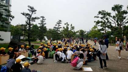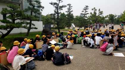 天守閣の下に到着しました。先生方から気をつけることと描くポイントの説明です。