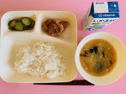 【ごはん、豚肉の香味あげ、みそ汁、きゅうりの甘酢づけ、牛乳】