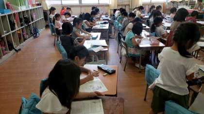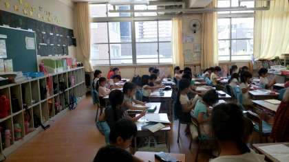 1年2組では1学期の 復習プリントに取り組んでいました。みんなどれだけ出来るようになったかな?