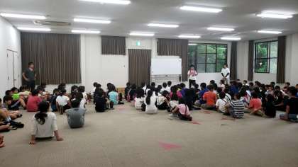 部屋割り後、避難訓練を行いました。外は雨が降っているので、ホールに集合しました!