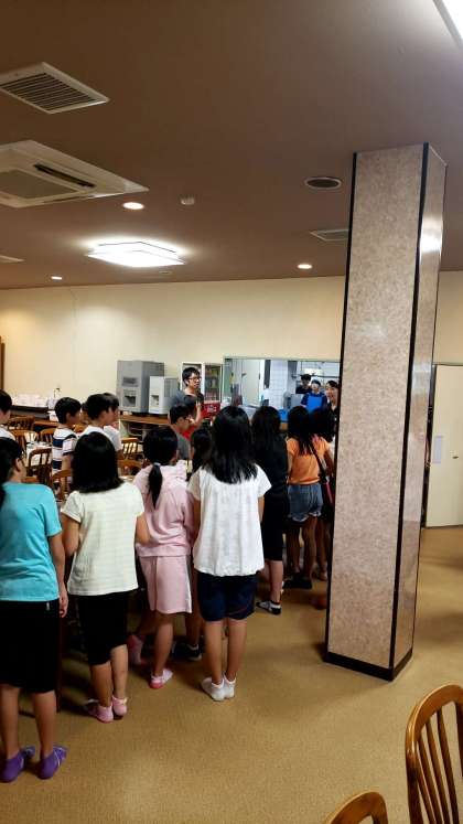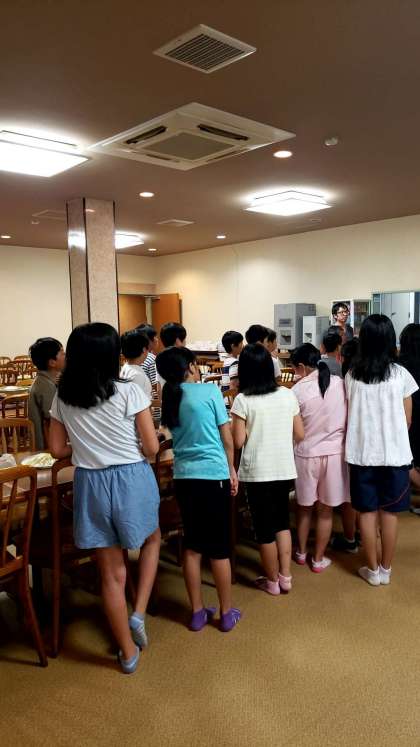 お待ちかね、夕食の時間です。まずは、食事係のみんなが説明を聞いています