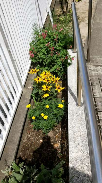 猛暑にも関わらず、花々は大きくすくすくと成長しています。来週から学校に戻ってくる子どもたちを正門の花も待っています!