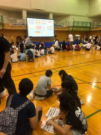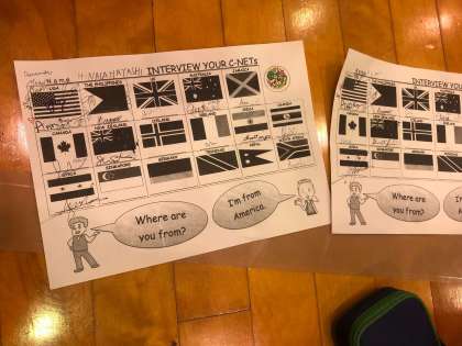 ゲーム等の対話型活動を通して世界の国々の文化について触れ、積極的に英語でコミュニケーションを図り、生き生きと楽しみながら活動するイベントです。今年は新高小学校からは6・5年生から8名参加しています。C-NETの先生の出身国を訪ねたり、好きなものをたずねて答えあったり。みんな楽しそうです。