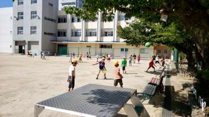 久しぶりに友達と会った子どもたち。早速、運動場でボール遊びです!