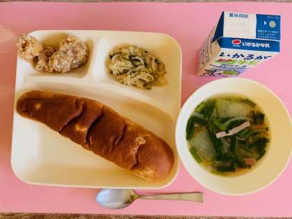 【おさつパン、鶏肉のからあげ、とうがんの中華スープ、切干しだいこんのごま辛みづけ、牛乳】