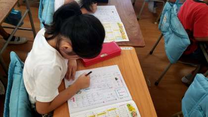 3組でも漢字の学習中。1組と同じ山という漢字をドリルを使って練習していました。