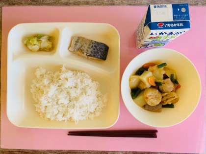 【ごはん、さごしの塩焼き、じゃがいもと一口がんもの煮もの、キャベツのおひたし、牛乳】