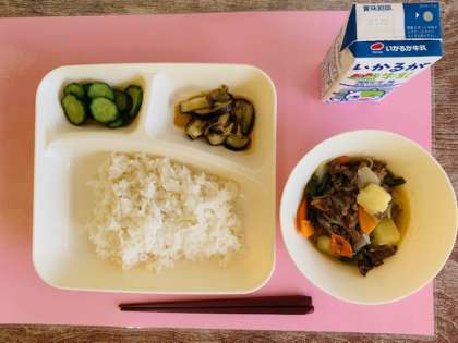 【ごはん、肉じゃが、焼きなすのみそだれかけ、あっさりきゅうり、牛乳】