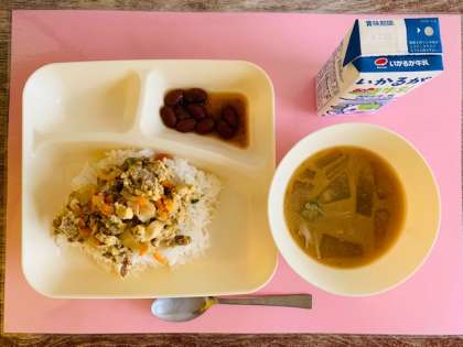 【他人丼、とうがんのみそ汁、金時豆の煮もの、牛乳】