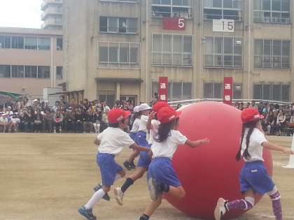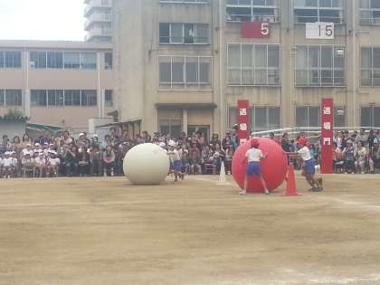 2年生は、「大玉ころがし」を行いました。自分の体よりも大きな大玉を転がします。子どもたちにとっては前が見えないので、それぞれの感覚で前へ玉を送らないといけません。手の指先を下にして大玉を転がします。間違えて、指を上にして押すように転がすと、ボールにのって自分も転がってしまい危険です。それぞれ、めいいっぱい走りながら、大玉ころがしにチャレンジしました。