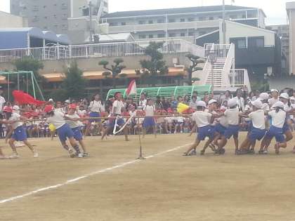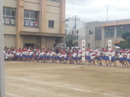 力いっぱい、引っ張り合いました。力の差がほとんどなかったので、勝敗が決まるまで時間がかかりました。赤組がリードしはじめ、引っ張れば引っ張るほど、子どもたちの観客席にまで入り込んでいきました。見ていた子たちも、応援しつつ間をあけて進められるようにしてくれました。勝敗は、赤組が勝ちました。