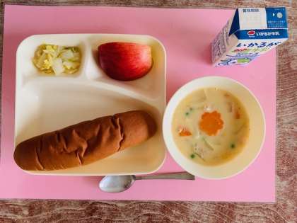 【黒糖パン、コーンクリームシチュー、はくさいのピクルス、りんご、牛乳】