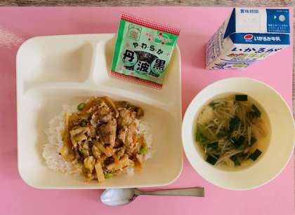 【ピリ辛丼、中華スープ、ソフト黒豆、牛乳】
