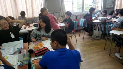 自分で物語を創作する学習です。まずは、あらすじや登場人物を考えています。