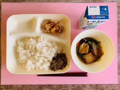 【ごはん、鶏肉のたつたあげ、あつあげと野菜の煮もの、おかかなっ葉、牛乳】