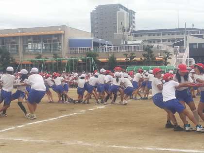 力いっぱい、チームで力を合わせて引っ張りました。2回戦目では、自分たちのチームの勝敗がついたら、ほかのチームへ応援で引っ張る方法で試合をしました。なかなか決着のつかないチームは、体力勝負になりました。最後まで、あきらめずそれぞれがやり切りました。