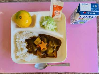 【ポークカレーライス、キャベツのサラダ、みかん、牛乳】