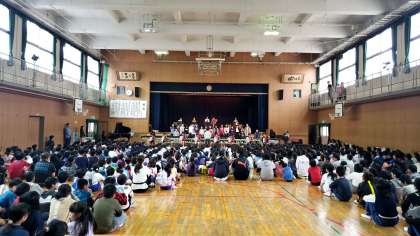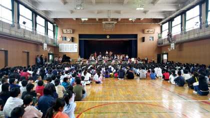 昨日の敬老会秋祭りで披露した演奏を全校児童の前で演奏しました。