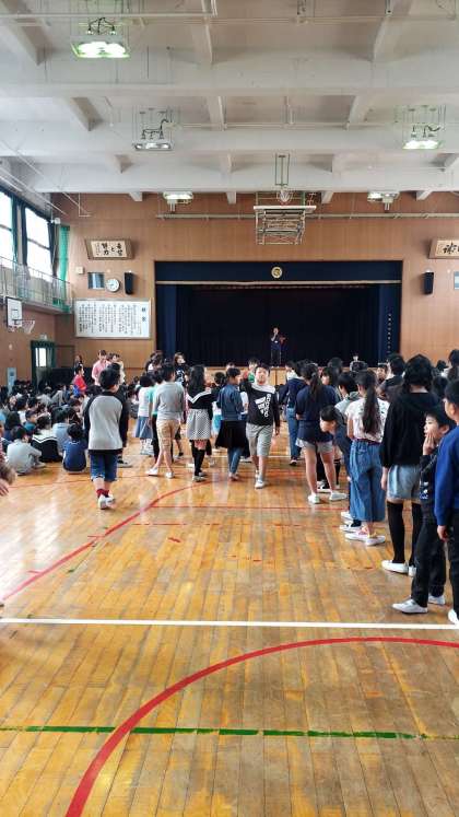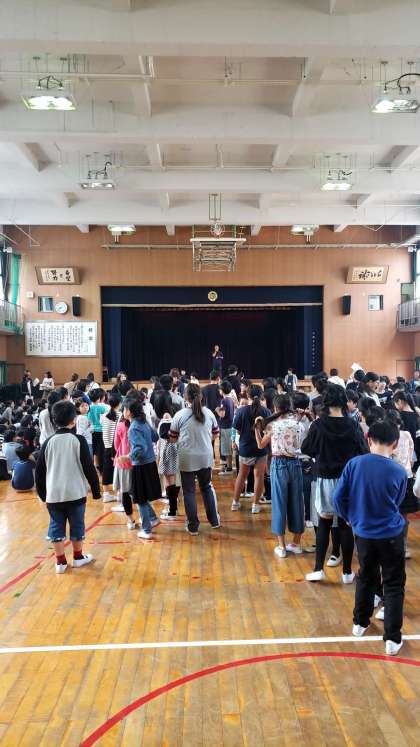 今日は、運動場のコンディションが悪いので、講堂で集会を行いました。