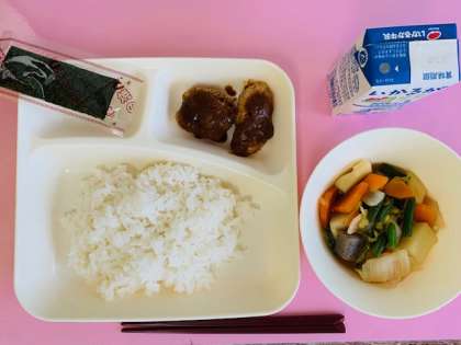 【ごはん、みそカツ、じゃがいもと野菜の煮もの、焼きのり、牛乳】