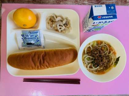 【大型コッペパン、ブルーベリージャム、タンタンめん、れんこんのオイスターソース焼き、みかん、牛乳】