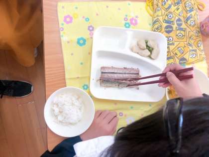 今日の給食のさんまのさんしょう焼きで使われているさんまは、骨つきでした。