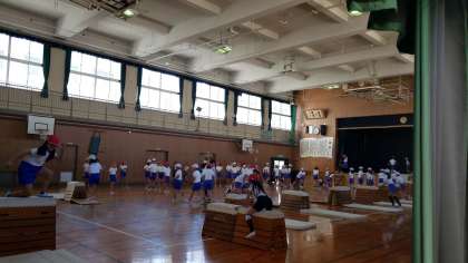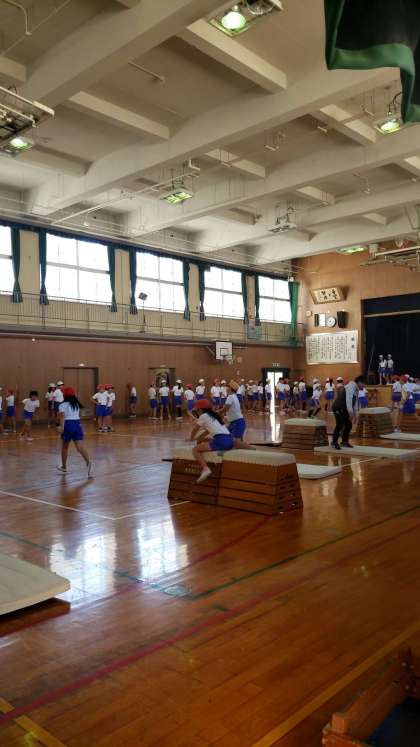 グループに分かれて、 開脚跳びや へいきゃくとびにチャレンジしていました。
