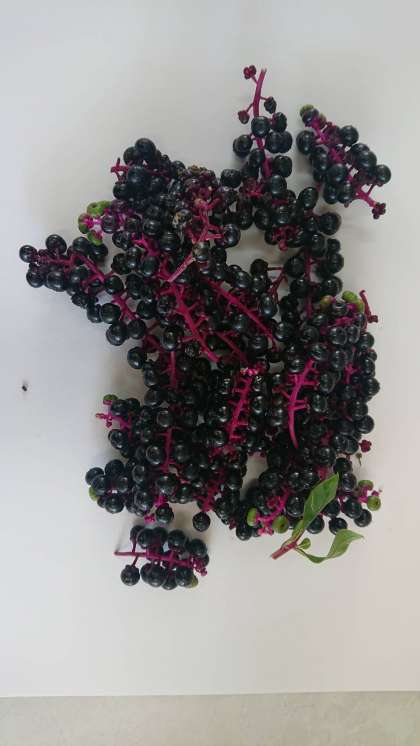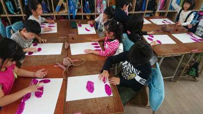 先日、学習園で収穫したさつまいもの絵を、ヨウシュヤマゴボウという植物の実を使って描きました。