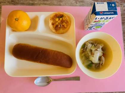 【黒糖パン、豚肉とキャベツのスープ煮、変わりピザ、みかん、牛乳】