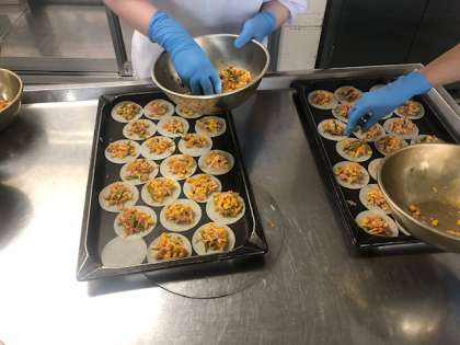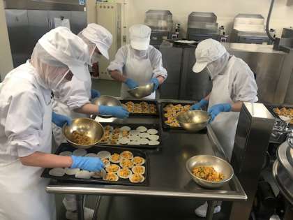 今日は、775個の変わりピザを作りました。給食調理員さんが、1つずつぎょうざの皮を並べて、丁寧に具をのせていきます。(写真2枚目、写真3枚目)