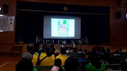まずは、講堂でビデオを見ながら、自転車の正しい乗り方やルールについて学習です。