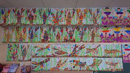 ザリガニと芋掘りの絵画です。どれも迫力満点の作品ですね!