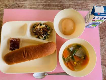 【大型コッペパン、いちごジャム、スープ煮、ほうれんそうのグラタン、白桃(缶詰)、牛乳】