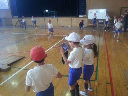 各グループで跳んだときの様子をipadで動画をとっているところです。