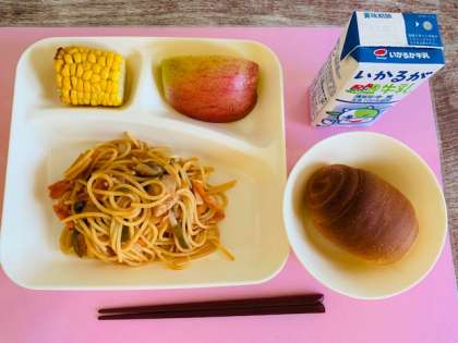 【黒糖パン1/2、きのこのスパゲッティ、焼きとうもろこし、りんご、牛乳】